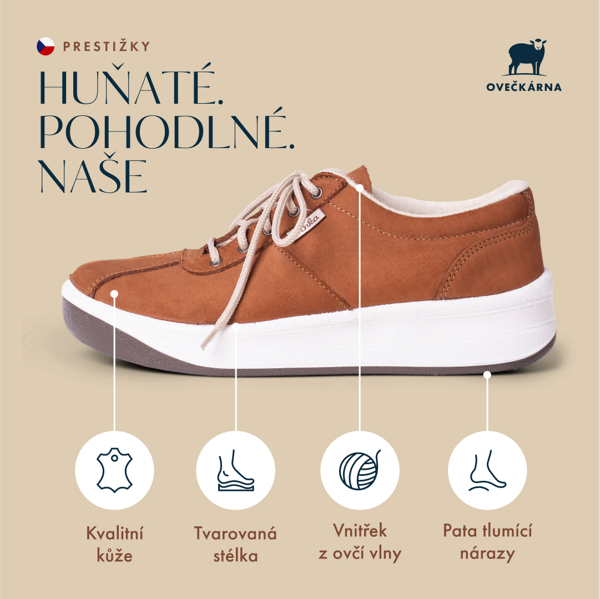 Z našeho poslání zabalit Evropu do ovčí vlny, vznikla myšlenka na vytvoření nových Huňatých Prestižek. A protože nás Ovečkárnu i Moledu spojuje záměr přinášet kvalitní tradiční produkty všem lidem, rozhodli jsme se pustit do společné tvorby. Díky spojení ovčí vlny a kvalitní kůže vznikl unikátní český produkt, který je zajímavý nejen vzhledem, ale především svými funkčními benefity. A právě touto obuví vám chceme dopřát pocit pohodlí a hřejivého tepla i při delším nošení. Jsou zkrátka huňaté, pohodlné a naše: