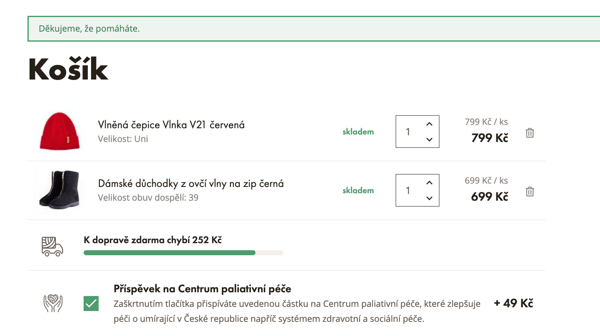 Pomoci můžete jednoduše, stačí když při nákupu na našem e-shopu zaškrtnete v košíku políčko „Příspěvek na Centrum paliativní péče". Možnost přispět máte do 27. prosince 2022, poté vybranou částku pošleme na účet Centra paliativní péče. Výše příspěvku je 49 Kč, což pro někoho může znamenat vynechat jednu kávu v kavárně a jiným pomoci v těžkých chvílích. Pokud chcete přispět jinak než v objednávce, můžete zaslat příspěvek prostřednictvím portálu darujme.cz. Více informací ohledně poskytnutí daru skrze příplatek najdete zde.