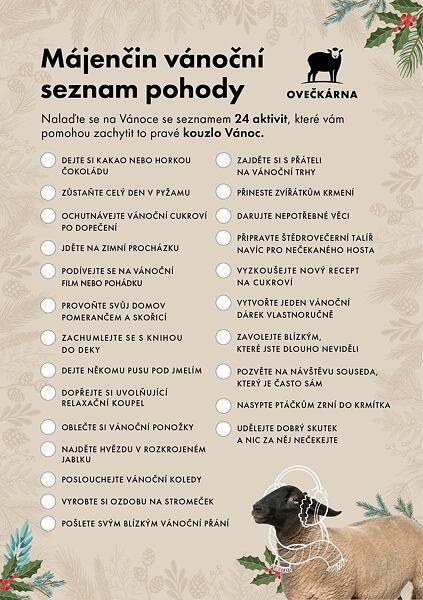 Pokud jste se na Vánoce ještě nestihli naladit, pak vám přijde vhod Májenčin seznam vánoční pohody, díky kterému zapomenete na předvánoční shon a načerpáte vánoční atmosféru. Seznam obsahuje 24 aktivit, které rozhodně musíte do Vánoc stihnout. Seznam si můžete stáhnout, vytisknout a pak už stačí jen nechat se unést vánoční náladou.