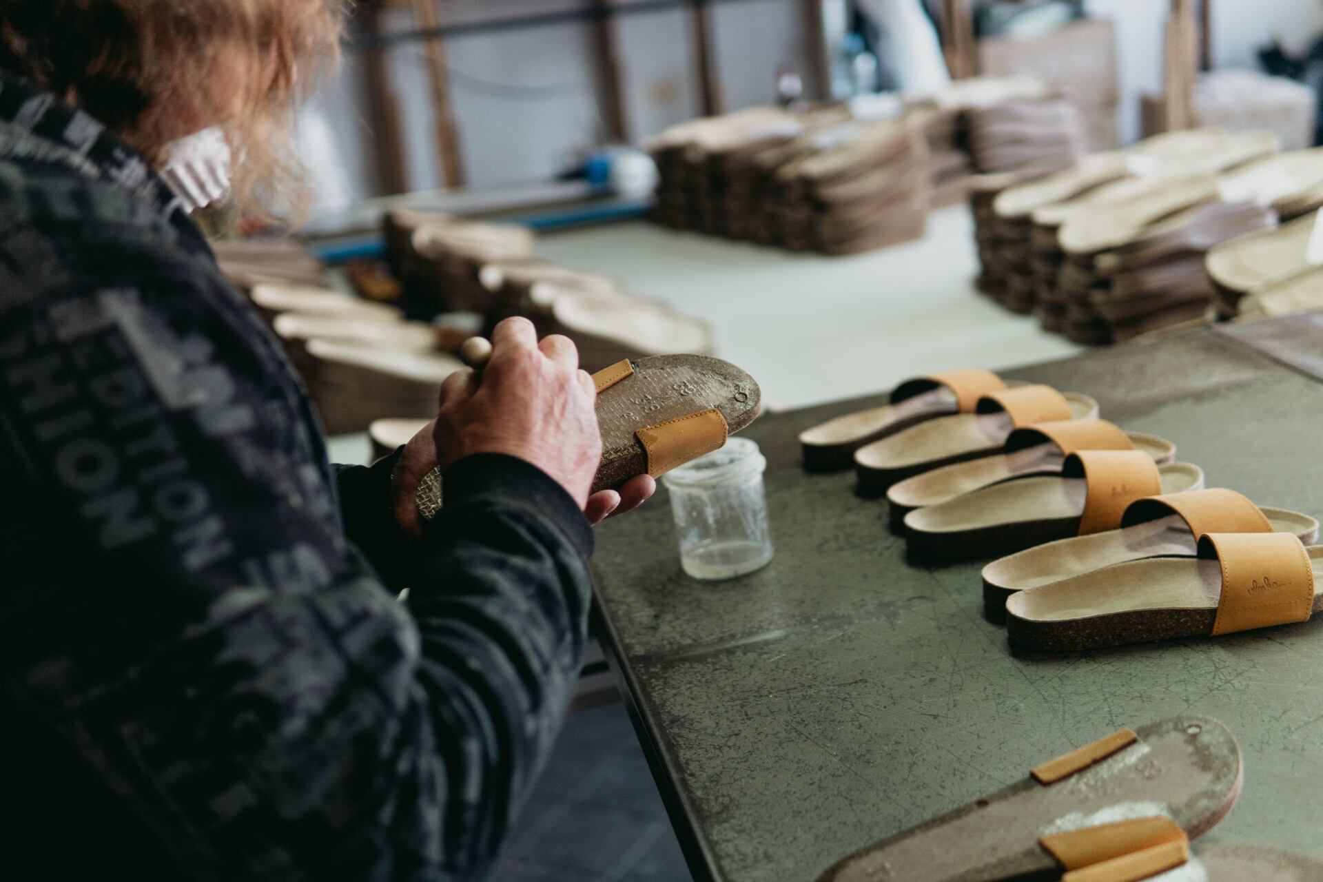 Výroba tedy začíná výběrem kvalitního korku a kůže v několika barevných variantách. Z pečlivě vybrané kůže se vyřezávají jednotlivé tvary, které se následně ručně lepí na spodní stranu korkové stélky.