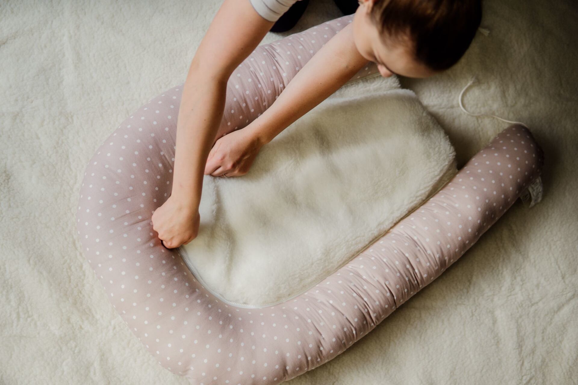 Na rozdíl od kojícího polštáře, který si můžete odepnout z hnízdečka, má tento lépe přizpůsoben tvar - střední část je plošší pro větší pohodlí miminka. Výplní je v tomto případě ovčí vlna.