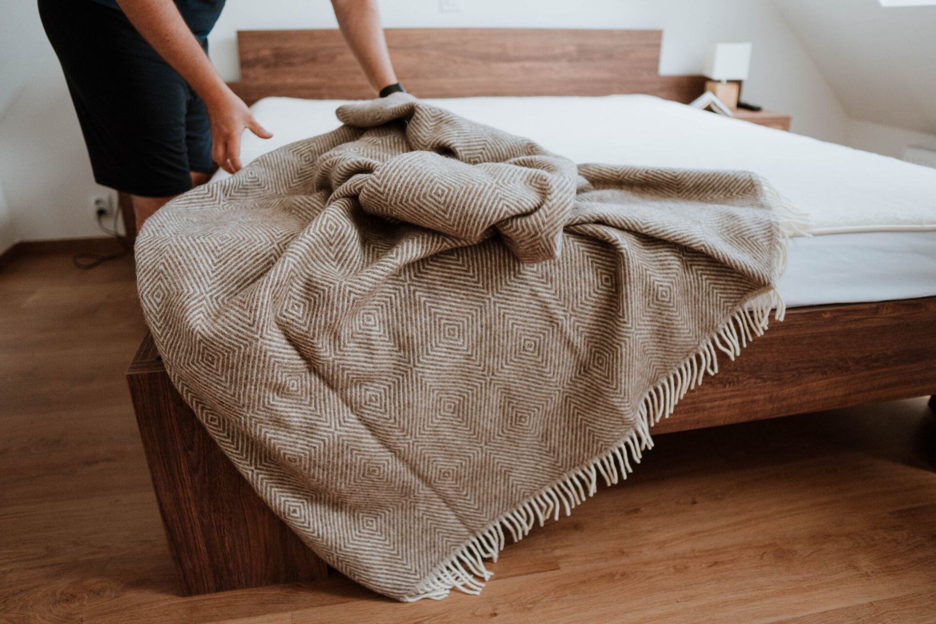 Deky a plédy z ovčí vlny mají schopnost pohlcovat vlhkost a vyrovnávat teplotu těla, a tak vás zima a chlad nezastihne ani na vaší oblíbené chatě nebo na cestách. Vzít si s sebou příjemný pocit pohodlí a tepla domova je přeci bezvadné. Ovčí vlna má tu výhodu, že je vhodná pro alergiky. Což znamená, že se v dekách neshromažďují ani nemnoží bakterie a mají samočistící schopnost. Je to tedy ideální volba i pro ty, kteří neradi perou. A pro příjemný pocit čistoty tak stačí zajistit časté větrání na čerstvém vzduchu.